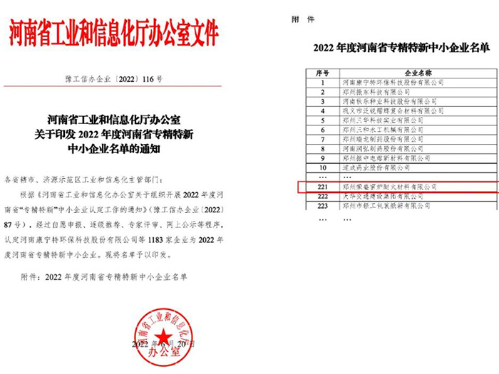 近日,河南省工業(yè)和信息化廳公布了《河南省工業(yè)和信息化廳辦公室關(guān)于印發(fā)2022年度河南省“專(zhuān)精特新”中小企業(yè)名單的通知》。經(jīng)省工業(yè)和信息化廳組織專(zhuān)家評(píng)審,鄭州榮盛窯爐耐火材料有限公司被認(rèn)定為2022年度河南省“專(zhuān)精特新”企業(yè)。這是繼榮獲“國(guó)家高新技術(shù)企業(yè)”、“河南省科技型中小企業(yè)”后,榮盛耐材在科技創(chuàng)新領(lǐng)域獲得的又一殊榮。