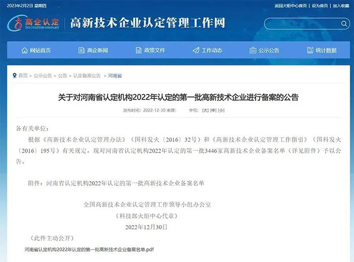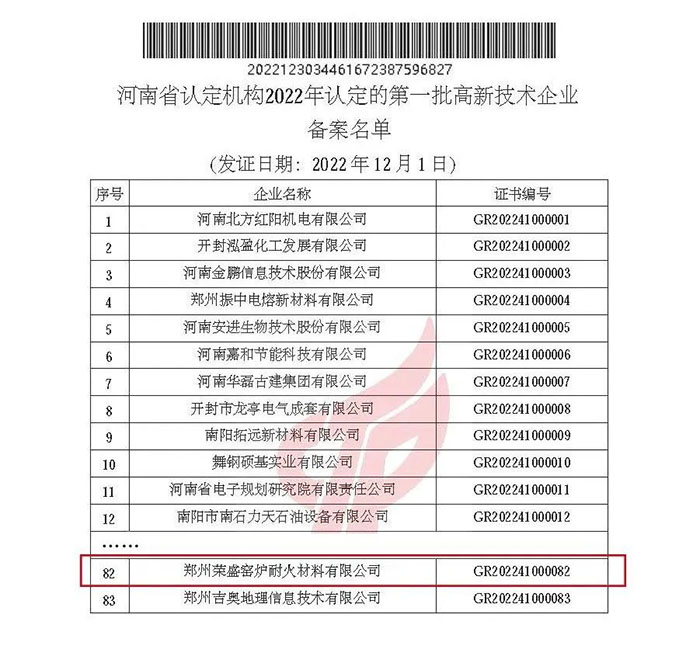 近日,高新技術(shù)企業(yè)認(rèn)定管理工作領(lǐng)導(dǎo)小組辦公室發(fā)布了《關(guān)于對(duì)河南省認(rèn)定機(jī)構(gòu)2022年認(rèn)定的一批高新技術(shù)企業(yè)進(jìn)行備案的公告》。由多個(gè)部門審核推薦,經(jīng)專家評(píng)審,鄭州榮盛窯爐耐火材料有限公司通過2022年度“國(guó)家高新技術(shù)企業(yè)”復(fù)審。此次是2019年公司初次獲得國(guó)家高新技術(shù)企業(yè)以來,再次被復(fù)審認(rèn)定為國(guó)家高新技術(shù)企業(yè)。