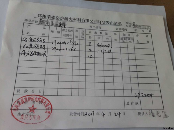 榮盛耐材訂貨發出清單