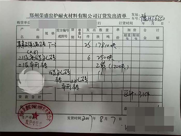 這次發(fā)貨的對(duì)象是江西的客戶,江西的客戶要了17810塊t-3莫來(lái)石保溫磚、250塊二級(jí)高鋁孔磚、120塊二級(jí)異型磚。江西客戶也是榮盛的老客戶了,這次的訂單江西客戶對(duì)榮盛表現(xiàn)出了十分的信任,并沒(méi)有派人再到鄭州進(jìn)行考察,是直接給榮盛銷售達(dá)到電話訂的單,并且在電話里表達(dá)出了想和榮盛保持長(zhǎng)期合作的態(tài)度,出于對(duì)合作伙伴的支持,榮盛也給了江西客戶優(yōu)惠的價(jià)格。