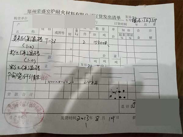 8月14日,鄭州榮盛耐材向寧波客戶準時發貨,這次發出的產品主要包括1540塊密度為1.0的T-38莫來石保溫磚、1540塊密度為1.0的T-38粘土保溫磚、730塊T-3 粘土保溫磚和24箱1200*600*50的陶瓷纖維板。