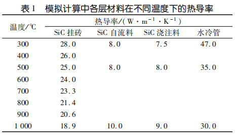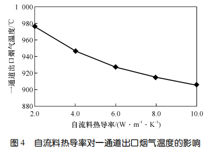 SiC 自流料熱導率對一通道出口煙氣溫度的影響圖4示出了自流料熱導率對一通道出口煙氣溫度的影響?梢钥闯,爐襯各工作層厚度固定時,一通道出口煙氣溫度隨自流料熱導率的升高而降低。通過調整自流料熱導率,一通道出口煙氣溫度差值高達 70 ℃。